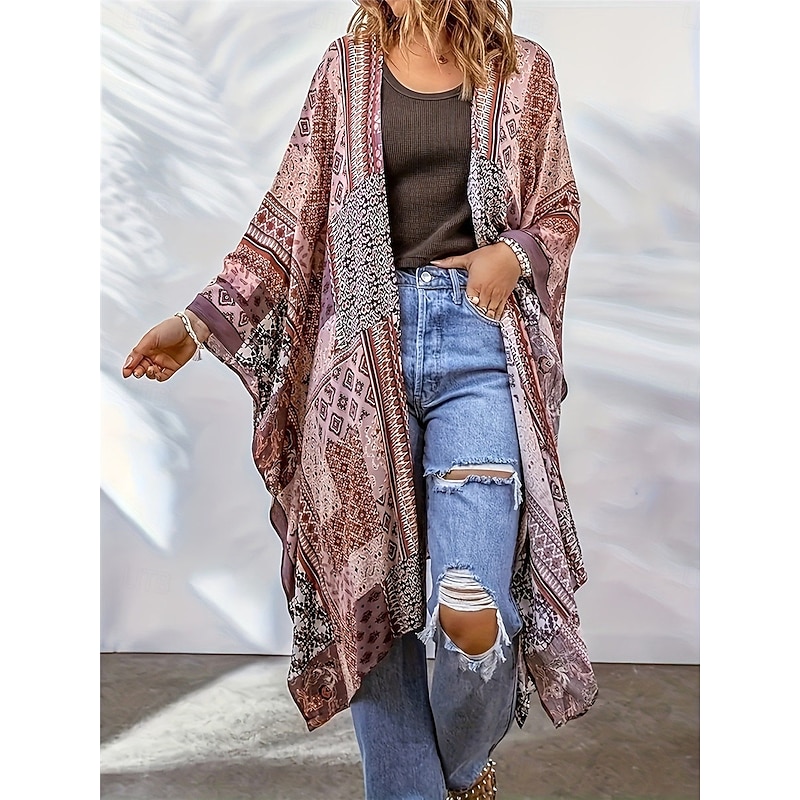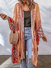 Highlights [Fabric] : Crafted from lightweight and breathable polyester, this women's casual jacket offers both comfort and durability. The fabric's micro-elastic quality ensures a flexible fit, making it ideal for layering during the transitional seasons of spring and fall. [Fit] : The regular fit of this long coat allows for ease of movement, perfect for daily wear and outdoor activities. Its open-front design and long sleeves provide a relaxed and casual vibe, suitable for a variety of body types. [Design Highlights] : The jacket features a striking floral and color block print, combining vibrant shades of black, orange, and purple to create an eye-catching aesthetic. This versatile piece is enhanced by its wide, flowing sleeves and collarless neckline, offering a stylish yet comfortable look. [Occasions] : Ideal for everyday wear, street outings, and outdoor events, this jacket is a stylish addition to any wardrobe. Whether you're heading out for a casual gathering or exploring the city, its thermal warmth and breathability make it a practical choice. [Size] : Available in a one-size option to fit a wide range of sizes, this jacket provides a convenient and adaptable fashion solution.