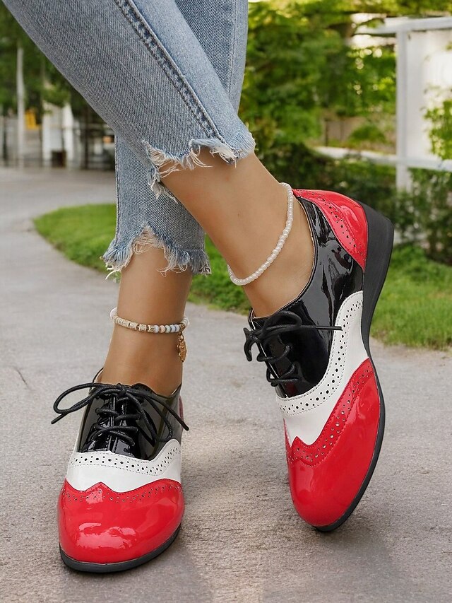 HOT ! Black Patent Leather Lace-Up Oxford Shoes with Brogue Detailing and Low Wedge Heel for Work and Formal Events