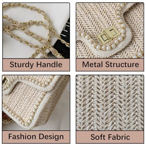 • 【Upgraded Materials】This straw crossbody bag is crafted from flat-woven PP straw and accented with chic pearl embellishments and a chain shoulder strap. It holds its shape well, whether empty or full. The eco-friendly straw is soft, wear-resistant, and paired with a tear-resistant polyester lining for added durability.