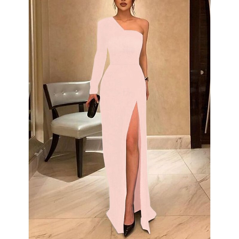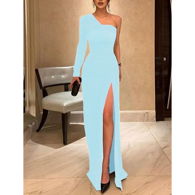 More information about Sheath Evening Gown Elegant Dress Prom Formal Evening Floor Length Long Sleeve One Shoulder Fall Wedding Guest Stretch Fabric with Sleek Slit Pure Color Masquerade Dress
