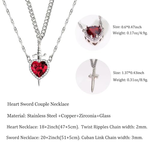 • MATERIAL --- Couples necklace chain crafted from high-grade 316L stainless steel, Smooth and hypoallergenic, comfortable to wear. High polish, will not rust or lose its luster. waterproof, lead-free, nickel-free, non tarnish. Sword charm made of lightweight copper. Heart charm made of copper and shiny zirconia, Help you get the compliments of most people.