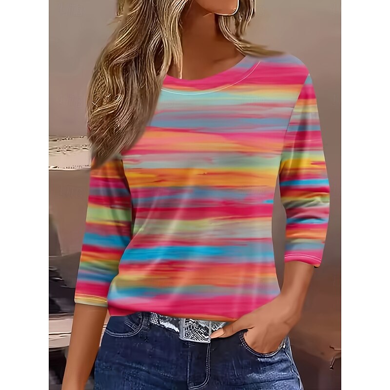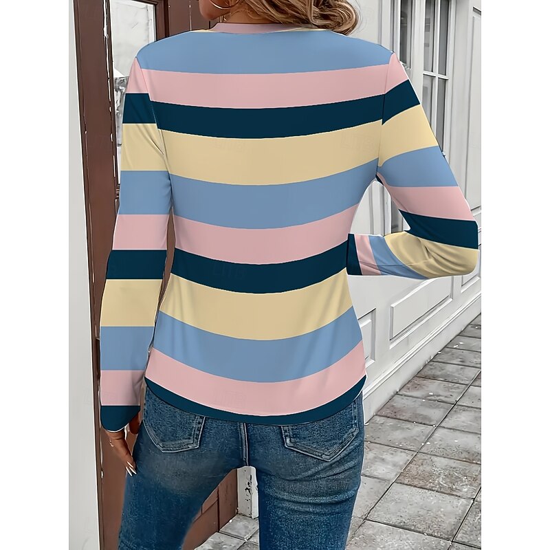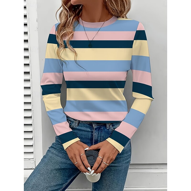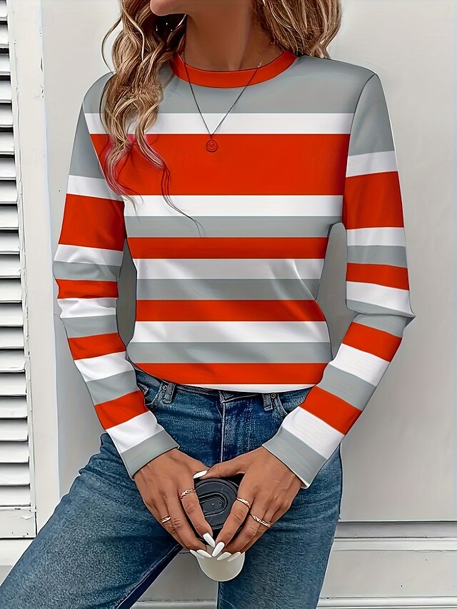 HOT ! Women's T shirt Crew Neck Long Sleeve Tunic Graphic Geometric Striped Vintage Stylish Classic Round Neck Regular Tops Daily Print Pink Red Fuchsia Fall