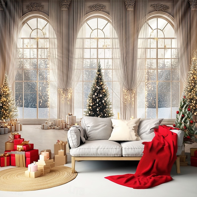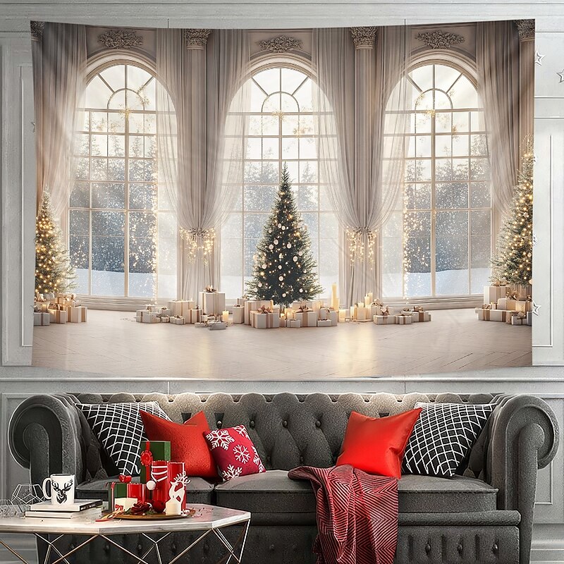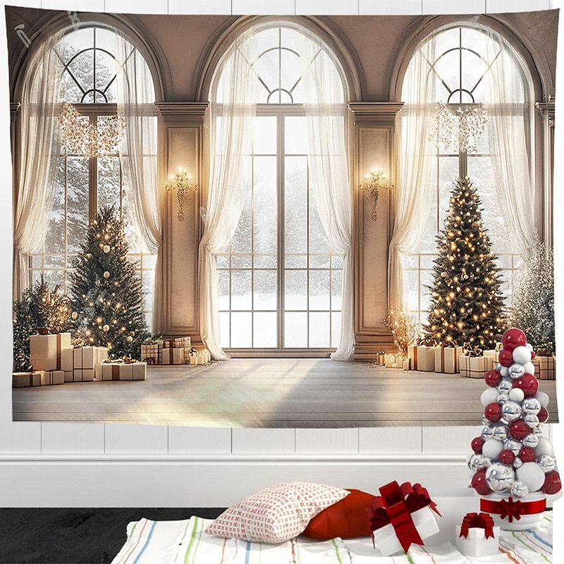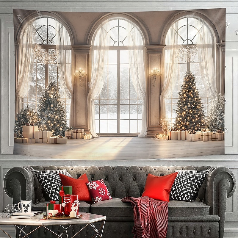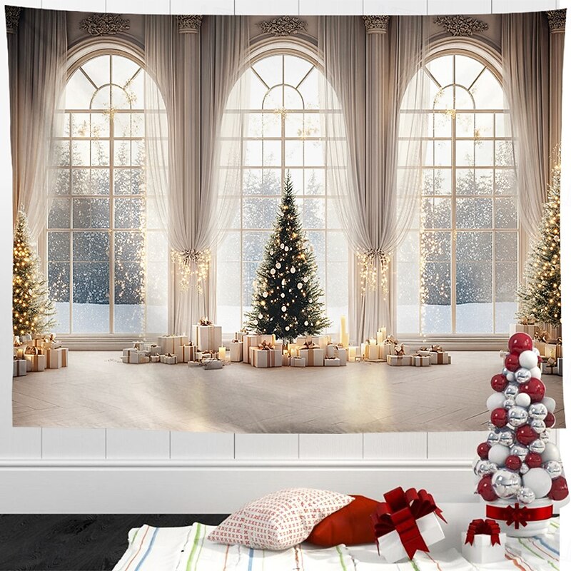 HOT ! Christmas Decorations Hanging Tapestry Wall Art Xmas White Window View Large Tapestry Mural Decor Photograph Backdrop Blanket Curtain Home Bedroom Living Room