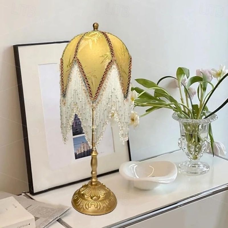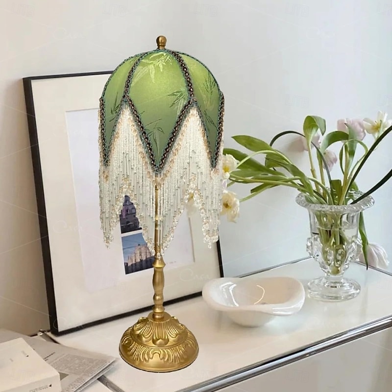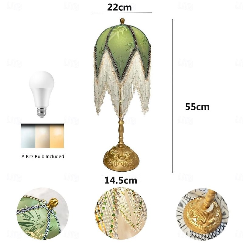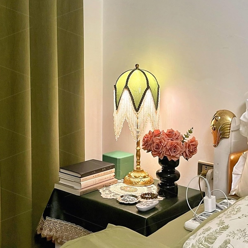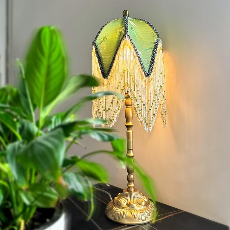 HOT ! LED Table Lamp 3-Color Light Source Tassel Retro Fabric Bedside Lamp Premium Classic Victorian Style Nightstand Lamp with Beaded Fringe Trim for Bedroom Study 110-240V