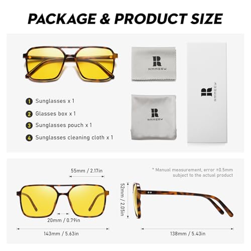 • Polarized UV400 Night Vision Yellow Lenses: These sunglasses cut glare and scattered light, enhance colors, and reduce eye fatigue by filtering harmful rays, including blue light, UVA, and UVB up to 400nm. Ideal for night driving or foggy days.