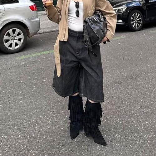 Vertundy Women's Fringe Boots Kitten Heel Pointed Toe Mid Calf Boots Tassels Design Fashion Suede Heeled Shoes 5