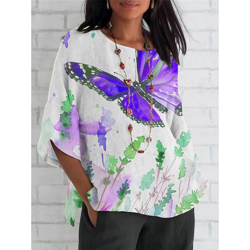 Why Choose Women's Shirt Butterfly Daily Casual 3/4 Length Sleeve Crew Neck Regular Tops Daily Holiday Print Yellow Blue Purple Fuchsia Orange Summer Spring Fall?