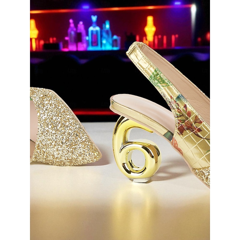 Women's Gold Glitter Slingback Pumps with Artistic Print and Sculpted Block Heels - Elegant Party Shoes for Nightlife and Clubwear 6