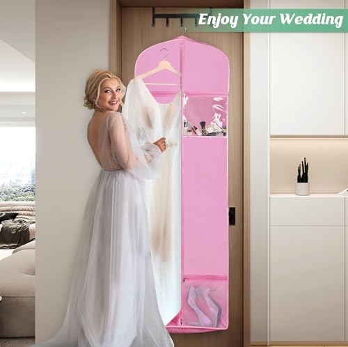 • Package: 1 pack 60" Foldable Garment Bags for Travel for Women Dress Bags for Gowns Long Hanging Bag for Closet Storage Dress Protector Bag for Gowns, Suits, Coats, Biege + 1 pack 70" Wedding Dress Garment Bag with Bride Tote Bag 8'' Gusseted Wedding Dress Bags for Gowns Long 4 Pockets Dress Cover for Women, Pink