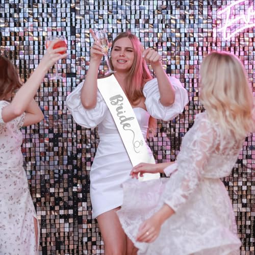• DESIGNED FOR THE BRIDE: Designed for the bride, this white satin ribbon with silver glitter on the straps to form the word “Bride” will make the bride-to-be stand out from the crowd.