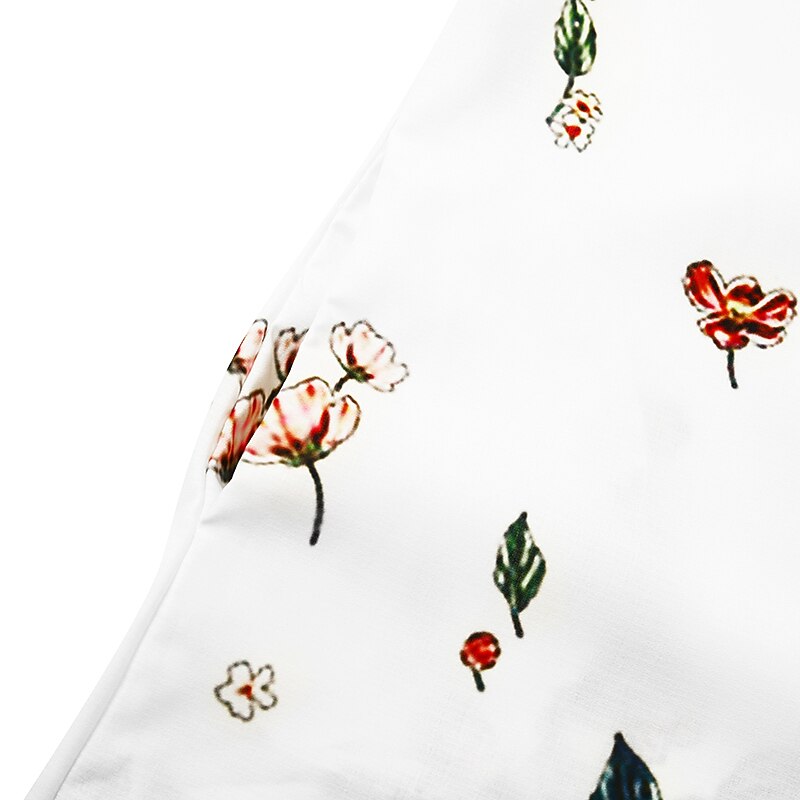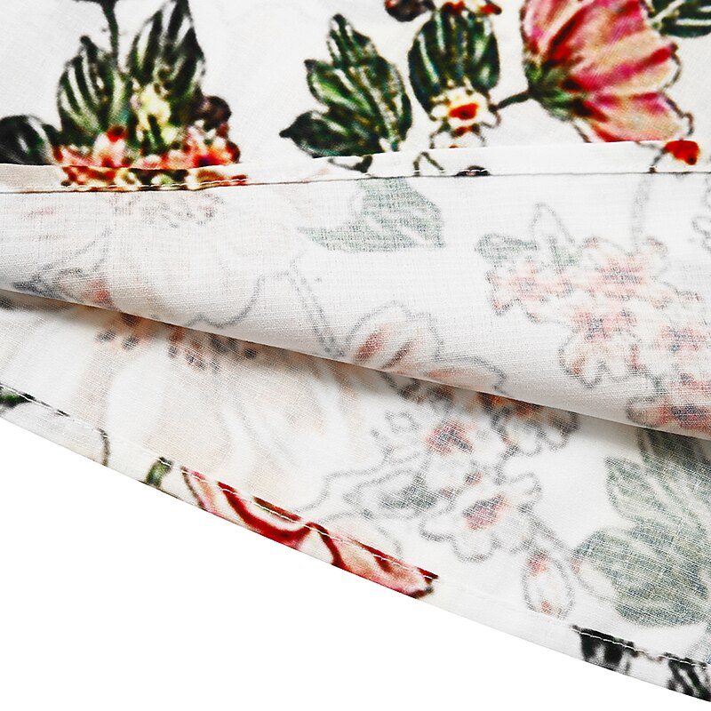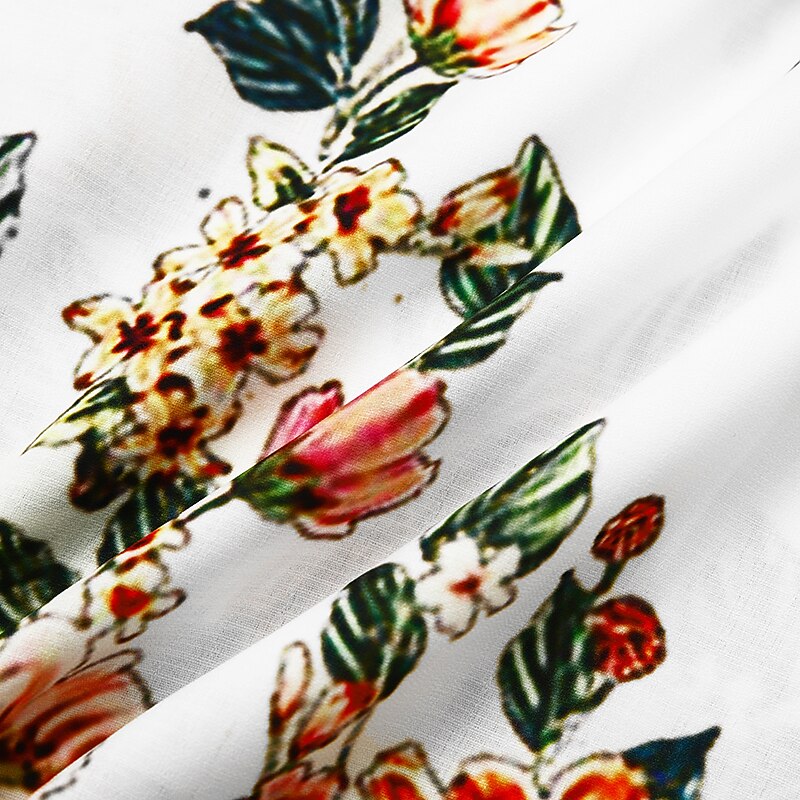 The dress features a flattering V-neckline and short sleeves, enhancing its casual yet chic appeal. The intricate floral print is a standout feature, set against base colors of white, green, or gray. The floral pattern, with shades of pinks, greens, and yellows, is strategically placed to add both whimsy and sophistication.