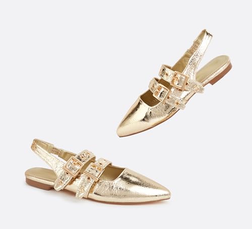 LUCKY STEP Women's Slingback Buckle Flats Ballet Poninted Toe Block Heel Dress Adjustable Strap Mary Jane Formal Wedding Shoes 6