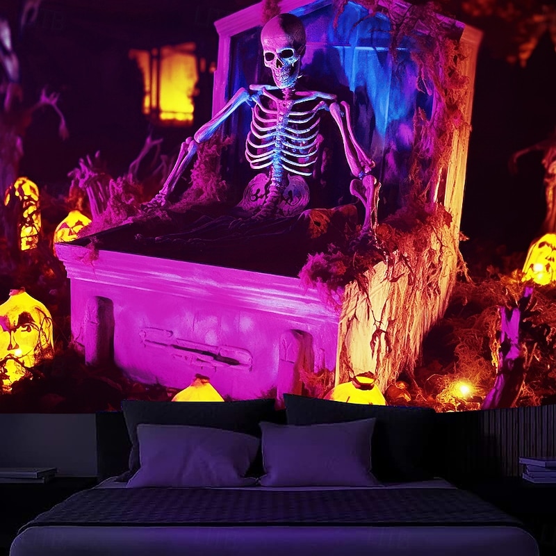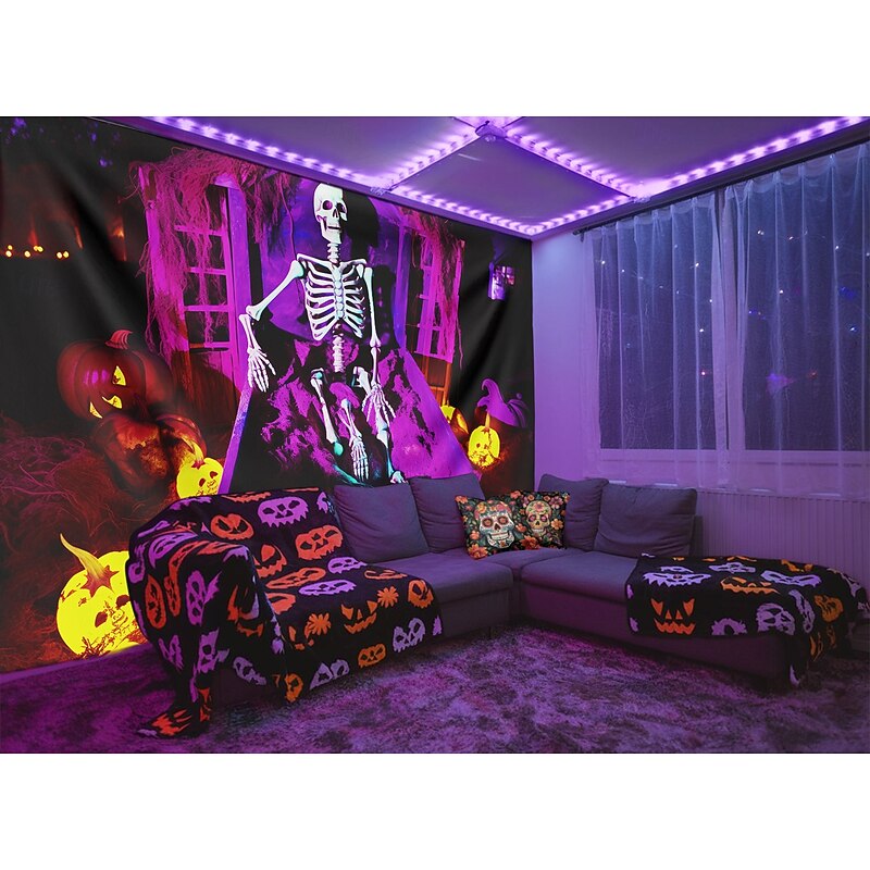 sought-after ! Halloween Decorations Skeleton Blacklight Tapestry UV Reactive Glow in the Dark Glow Party Trippy Misty Pumpkin Lights Hanging Tapestry Wall Art Mural for Living Room Bedroom