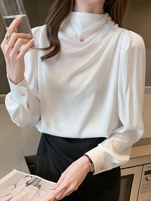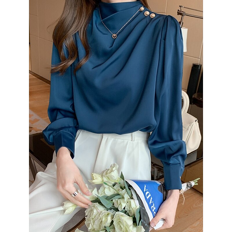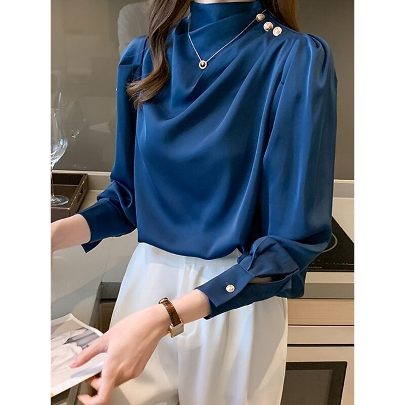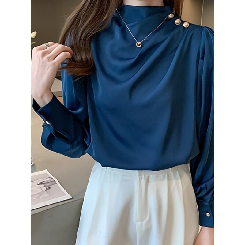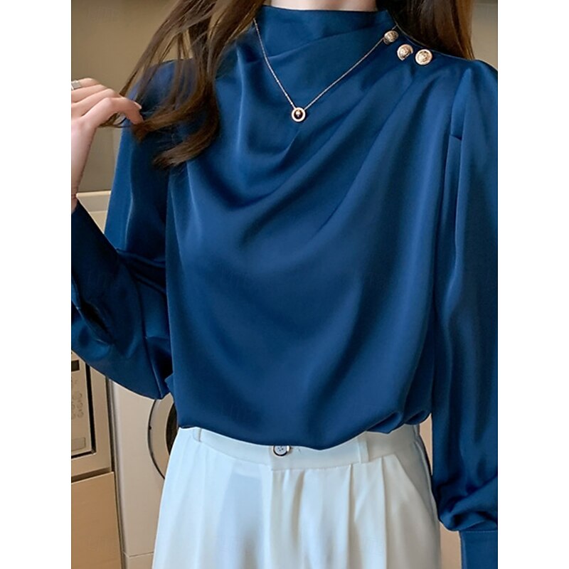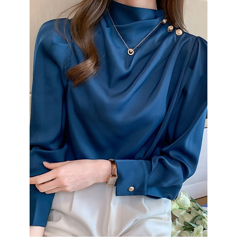 More information about Women's Shirt Elegant Dressy Satin Solid Color Business Modern Casual Long Sleeve Turtleneck Regular Tops Work Formal Wear Buttons White Blue Summer Spring