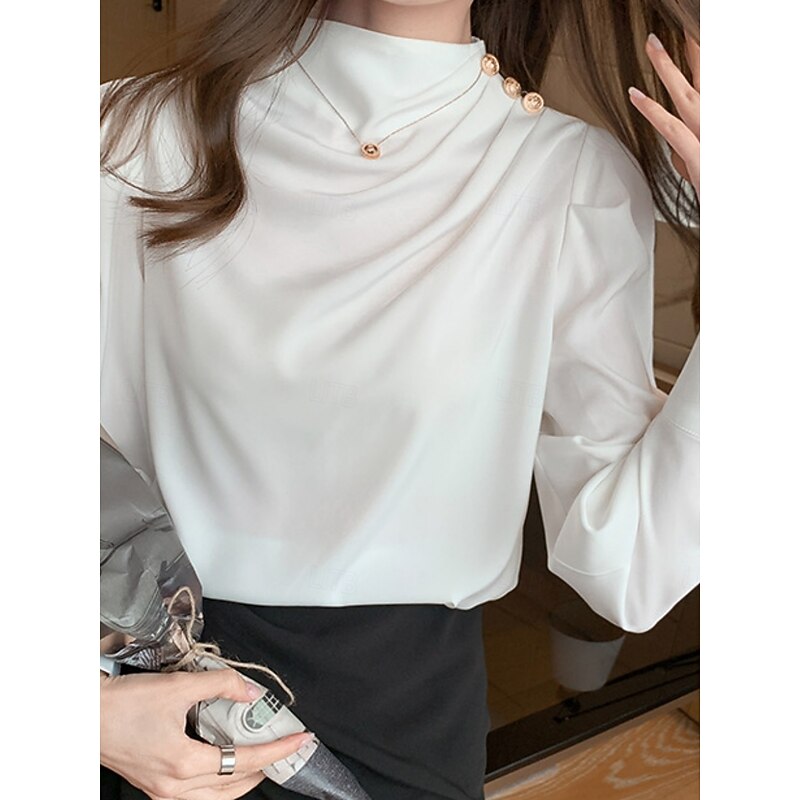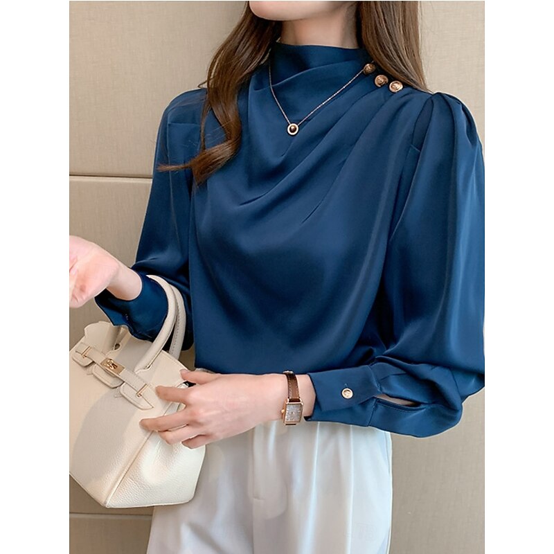 HOT ! Women's Shirt Elegant Dressy Satin Solid Color Business Modern Casual Long Sleeve Turtleneck Regular Tops Work Formal Wear Buttons White Blue Summer Spring