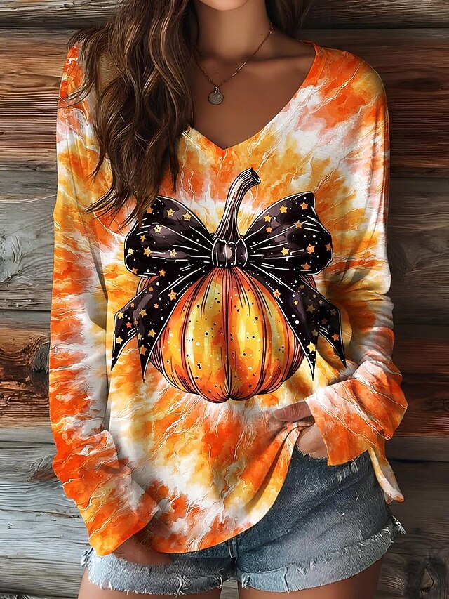 HOT ! Halloween Women's T shirt Pumpkin Graphic Vintage Stylish Casual Long Sleeve V Neck Regular Tops Daily Weekend Print Black Yellow Orange Brown Spring Fall