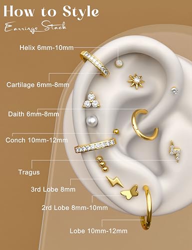 • Gold Flat Back Earrings--Come with 14 pairs earrings, 4 pairs huggie earrings, 10 pairs flat back stud earrings, 14k gold plated surface, non tarnish, not easy to fade and will not turn green. Dainty earring sets for multiple piercing,such as cartilage earring, helix piercing jewelry,tragus piercing jewelry, first hole, second hole, third hole etc.
