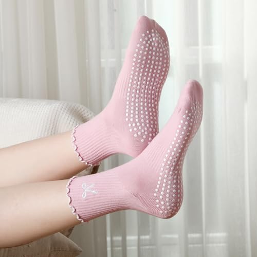 HOT ! Jeyiour 4 Pairs Cute Pilates Grip Socks for Women, Ruffle Non Slip Crew Grippy Yoga Socks with Bow for Gym Ballet Barefoot
