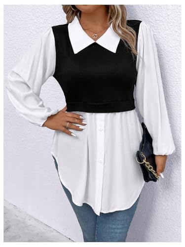 HOT ! OYOANGLE Women's Plus Size Colorblock Collared Lantern Long Sleeve Button Down Blouses Elegant Office Peplum Shirt Tops