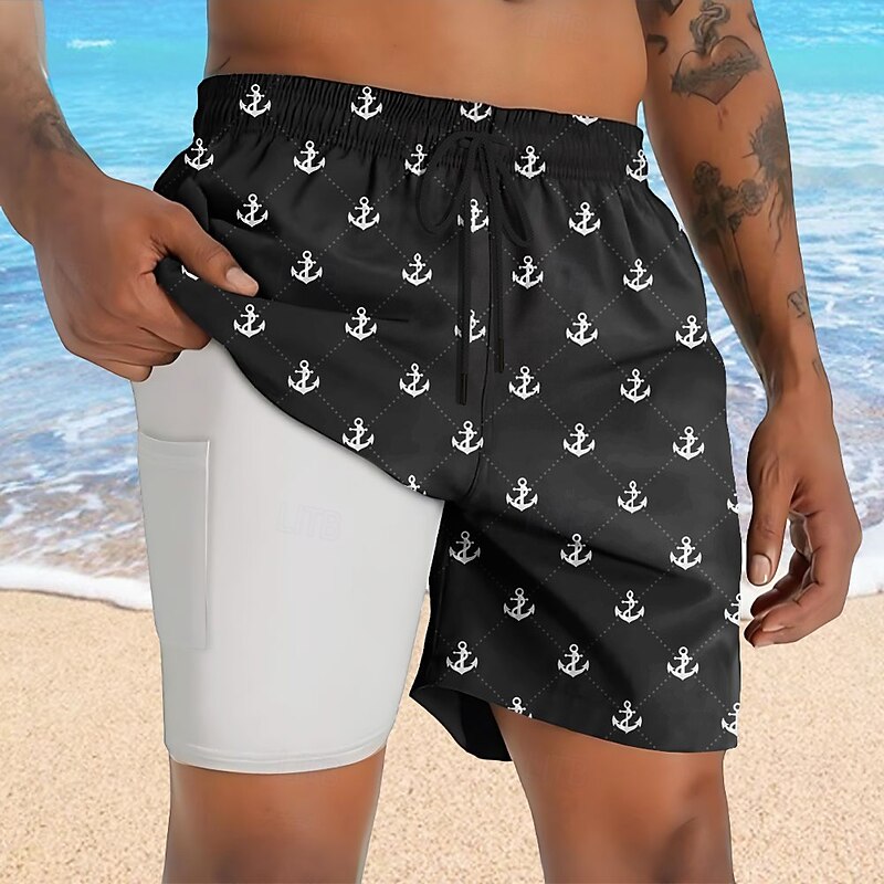 HOT ! Men's Nautical Anchor Lined Shorts 2 in 1 Board Shorts Swim Shorts Mid Waist Hawaiian Vacation Holiday Beach Wear Side Pockets With Compression Liner Elastic Drawstring Waist Designer Clothing Apparel