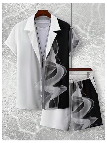 • Two piece outfit for men, graphic print, short sleeve button down collar shirt, drawstring waist shorts, casual and trendy set