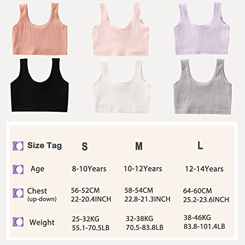 • Cotton Girl Bra:Our comfortable wire free bras are made of 95% cotton and 5% spandex. Sizes 8Years(fit for 8-10Years), Sizes 10Years(fit for10-12Years), Sizes 12Years(fit for 12-14Years) .Package content 6 pieces of girls' cotton training bras come with 6 colors, including white, grey, black, purple, pink, light red ,sufficient color and proper size for you to choose.