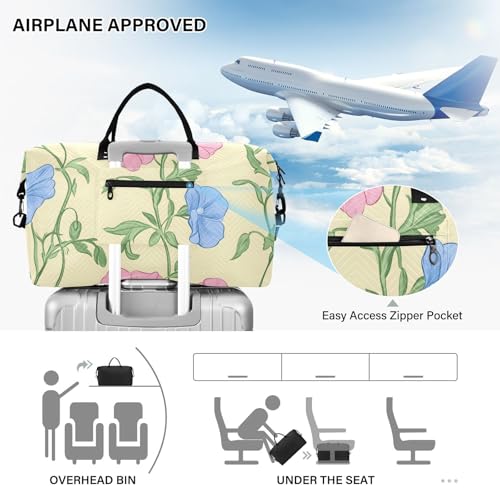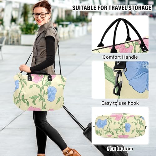 HOT ! Pink and Blue Pea Flowers Pattern Travel Duffle Bag, Large Weekender Overnight Bags for Women Men Waterproof Carry on Shoulder Tote Bags for Hospital Maternity Mommy Gym with Toiletry Bag