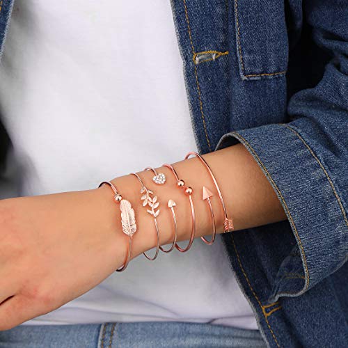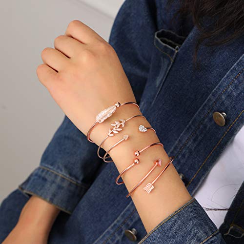 Softones 5pcs Bangle Rose Gold Bracelets for Women Heart|Olive Leaf|Arrow|Feather|Knot Heart Open Cuff Bracelet Set Adjustable 6