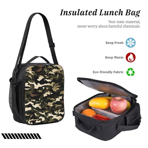 Lightweight Comfort: Despite its robust construction, the Camo print Backpack with Lunch Bag, Pencil Case is crafted from high quality Oxford fabric remains lightweight, making it easy to carry throughout the day without causing strain.Daily Essentials: 3PCS Camo print Backpack for Men Women features a backpack measuring 12.6x5.1x17 inches, paired with a lunch tote at 7.9x3.5x4.8 inches and a pencil case sized 8.7x1.8x4.3 inches for travel or work.Laptop Compatible of Backpack: The Lightweight Camo print Bookbag includes a spacious compartment that can accommodate a 15-inch laptop, making it suitable for both work and leisure activities.Effortless Access: The Camo print Lunch Bag features a smooth double zipper that glides open and shut with ease, providing quick and convenient access to your food. The zippers are designed for smooth operation, so you wonβt struggle to open or close the bag, even when you're in a hurry.Compact Convenience: Despite its generous storage space, the Camo print Pencil Case remains compact and easy to carry. It offers ample room for your writing tools, while still fitting neatly into your bag or backpack, perfect for keeping everything in one place. Perfect for everyday use. High quality materials and excellent craftsmanship ensure long-lasting durability.