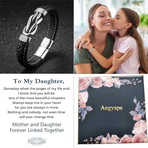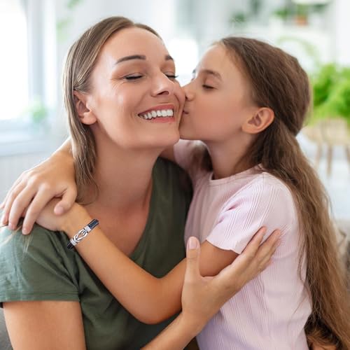 Mother and Daughter Forever Linked Together Braided Leather Bracelet, Inspirational Wristband for Women Stainless Steel Infinity Knot Engraved Leather Bangle Daughter Gift from Mom