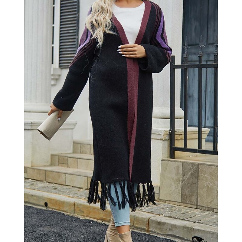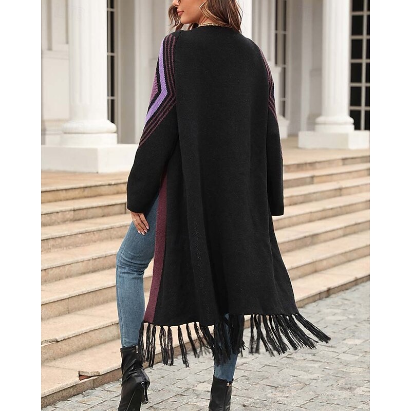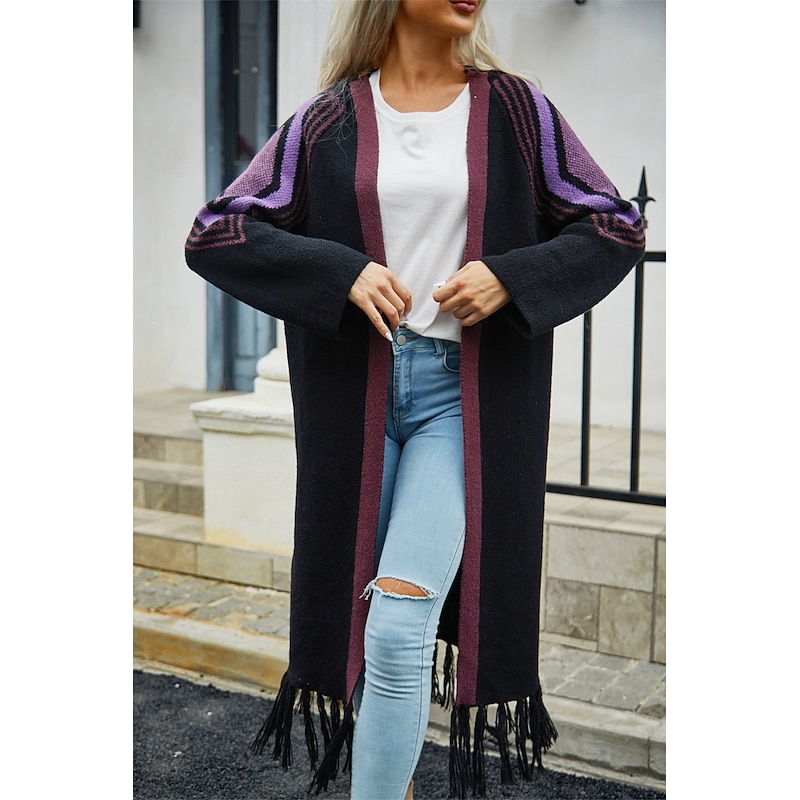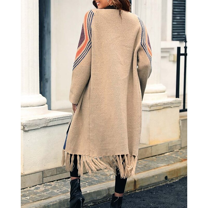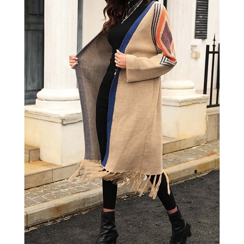 More information about Women's Long Cardigan Open Front Knit Tassel Fall Winter Outdoor Going out Weekend Fashion Daily Long Sleeve Geometric Black Camel