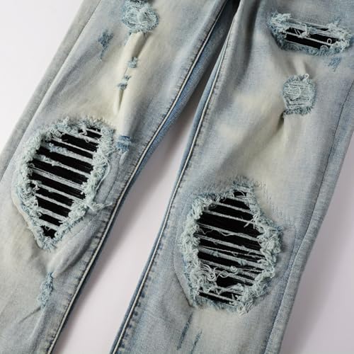 HOT ! Jeans Pants Trouser Denim Men Stretch Slim Fit Trendy Street Worn Hole Washed Light Blue Grinding Fading Retro Wrinkle Elastic Tight Casual Small Foot(Light Blue,29)