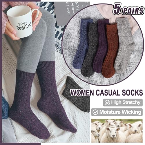 EBMORE 5 Pairs Merino Wool Socks for Women Thermal Warm Thick Winter Hiking Knit Cozy Crew Duty Work Soft Socks for Ladies 5