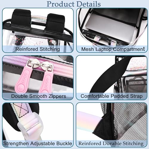 • 【Elegant Design】:The heavy duty clear stadium bag are designed with transparent design, convenient for you to quickly view the contents of the bag; The large clear backpack embedded a cute butterfly with colorful glisters sequins and the vibrant rainbow webbing makes you more different and more attractive, and feel happy all day.