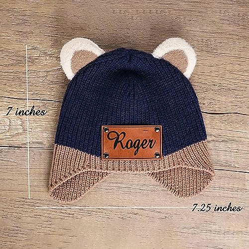 HOT ! Personalized Baby Beanie Hat, Custom Kids Name Winter Warm Hats with Leather Patch Toddler Knit Double Pom Pom Flake Hats for Infant Gift Blue