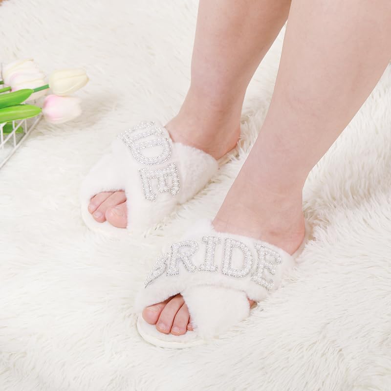 Bride Slippers for Wedding Day White Fuzzy Slippers with Pearls for Bachelorette Party Bridal Shower Gifts 6