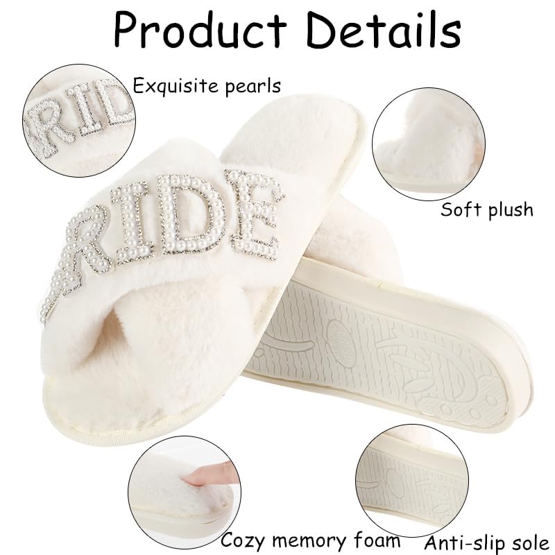 Bride Slippers for Wedding Day White Fuzzy Slippers with Pearls for Bachelorette Party Bridal Shower Gifts 7