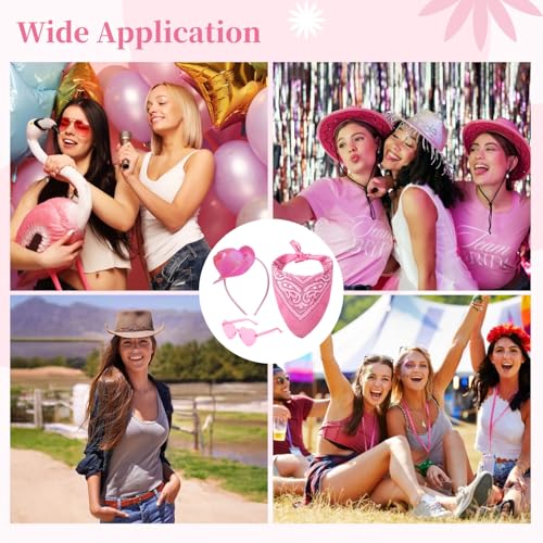 • Glittery & Eye-Catching: The headbands feature sparkling pink mini cowgirl hats; shimmering finish stands out in photos and on the dance floor; vibrant color pairs with playful heart glasses and classic bandanas for a lively party look