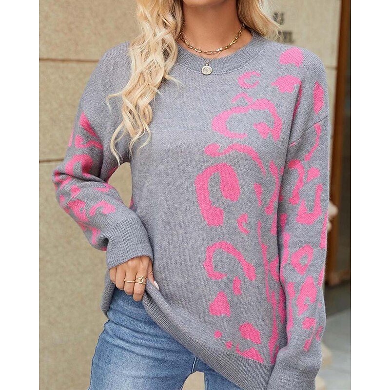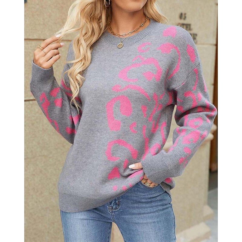 Women's Sweater Casual Graphic Leopard Crew Neck Knitted Long Sleeve Regular Tops Knit Weekend Black Gray Fall Winter 7