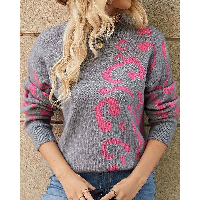 Women's Sweater Casual Graphic Leopard Crew Neck Knitted Long Sleeve Regular Tops Knit Weekend Black Gray Fall Winter 9