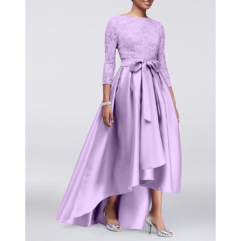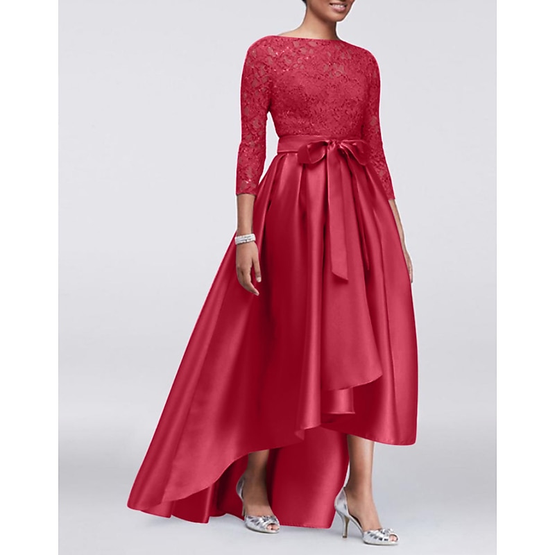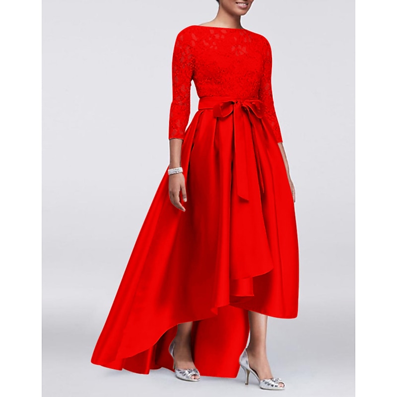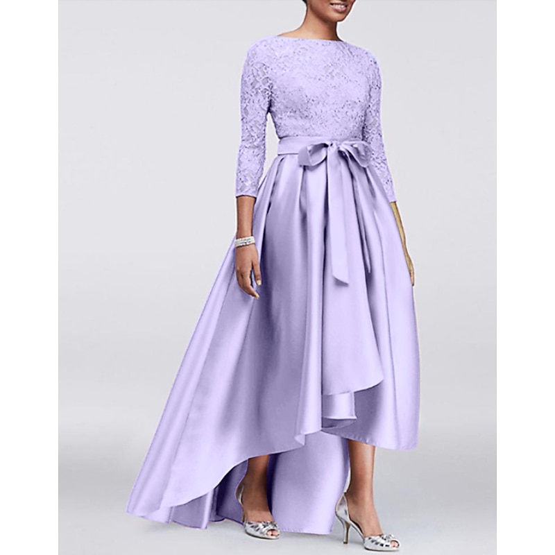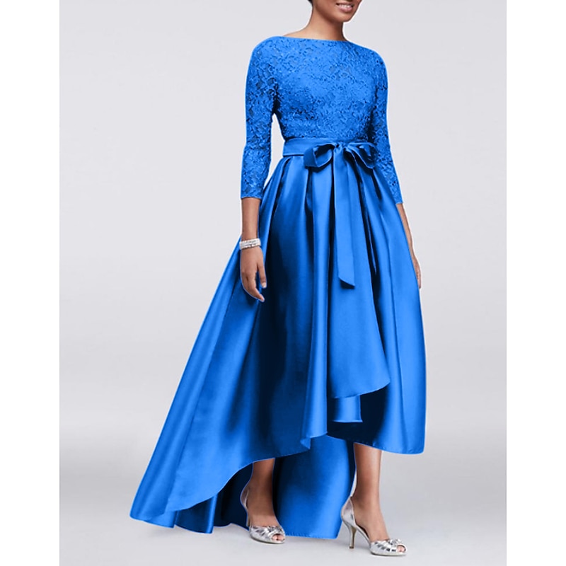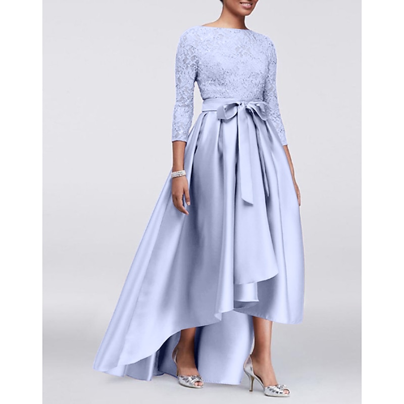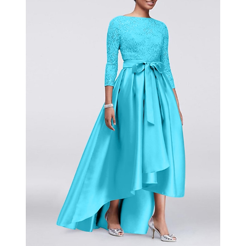 More information about A-Line Mother of the Bride Dress Wedding Guest Elegant Plus Size High Low Jewel Neck Asymmetrical Satin Lace 3/4 Length Sleeve with Sash / Ribbon Appliques