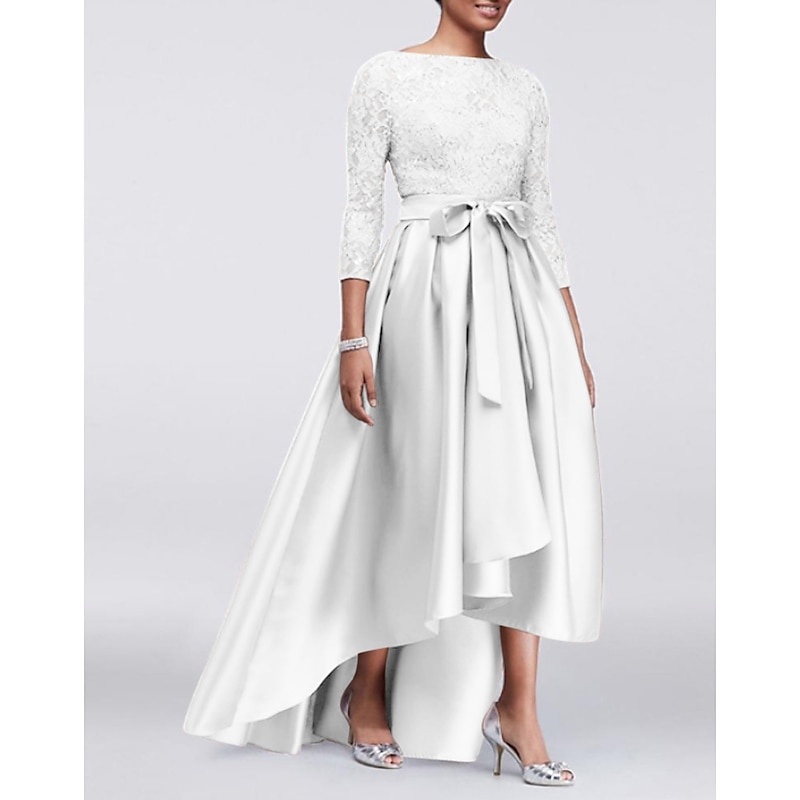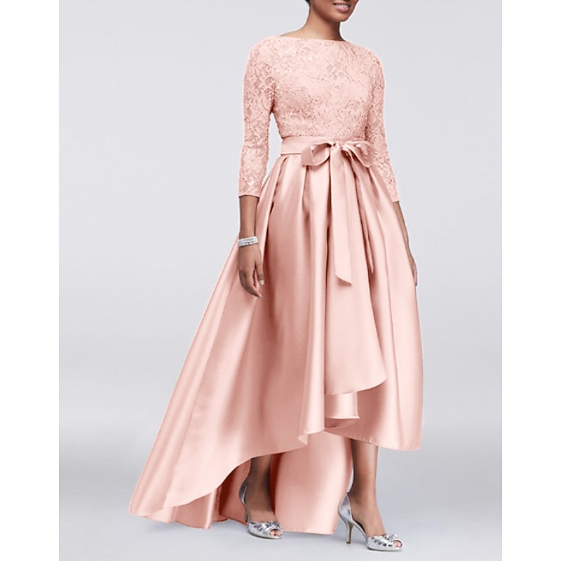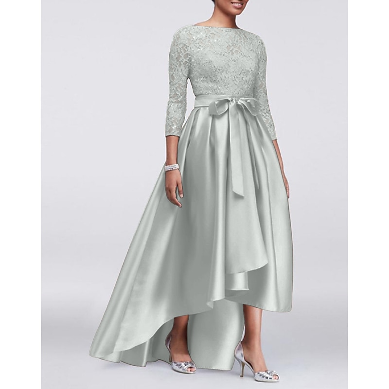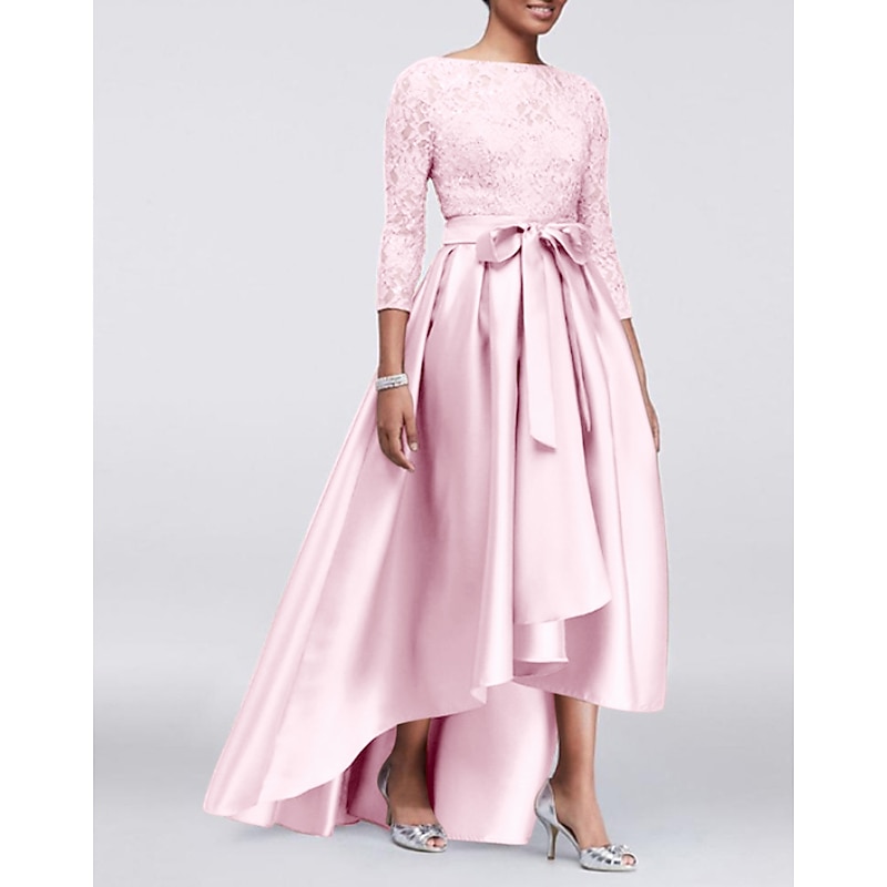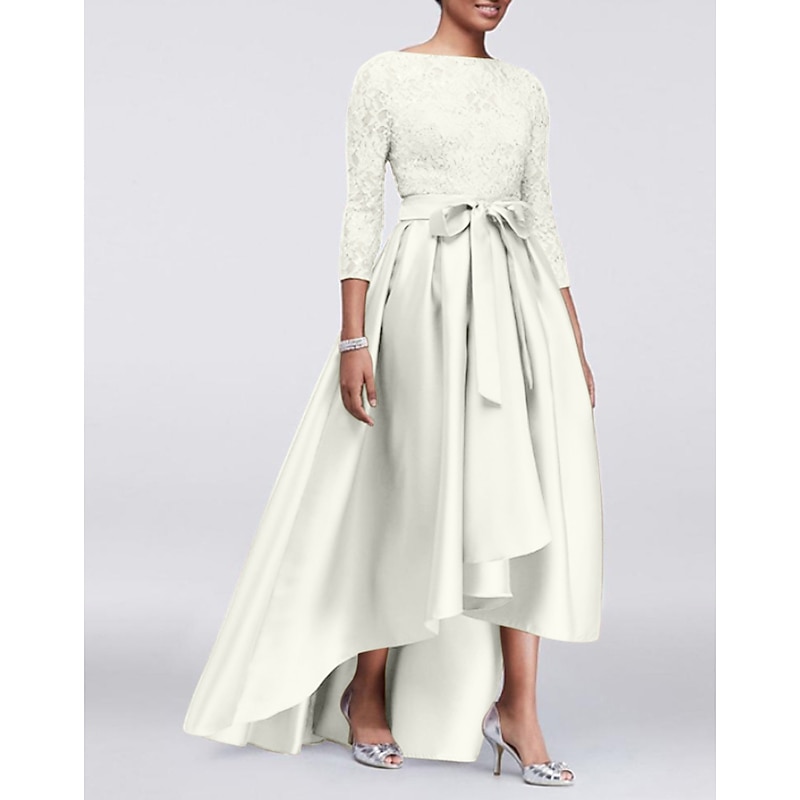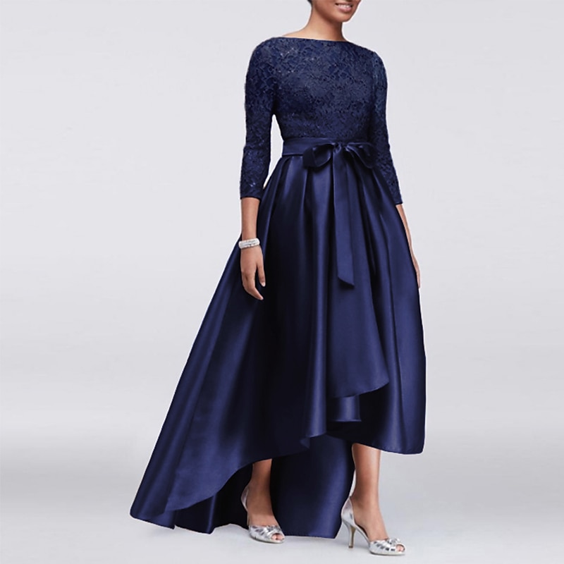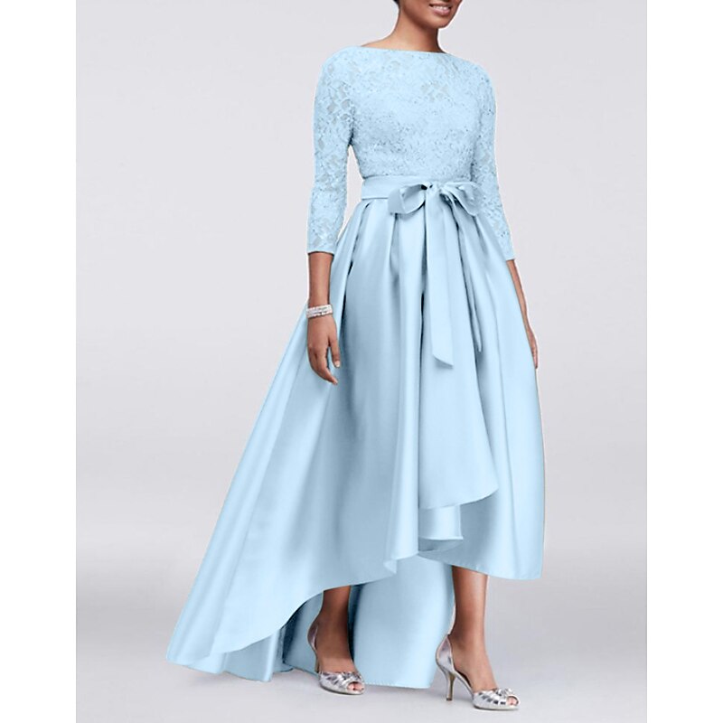 More information about A-Line Mother of the Bride Dress Wedding Guest Elegant Plus Size High Low Jewel Neck Asymmetrical Satin Lace 3/4 Length Sleeve with Sash / Ribbon Appliques