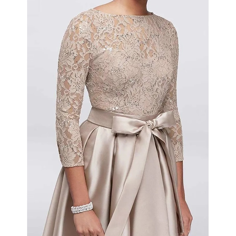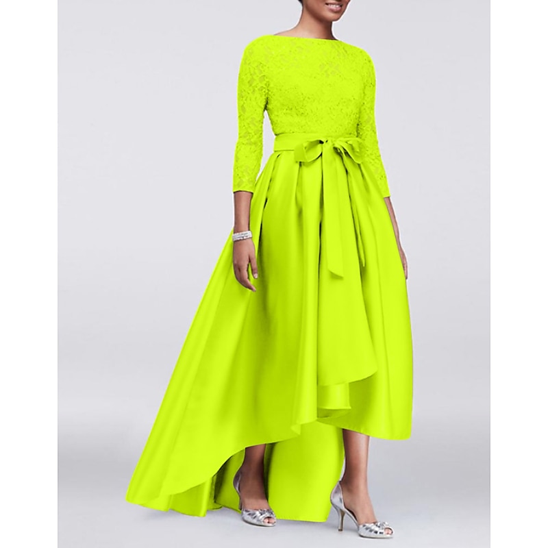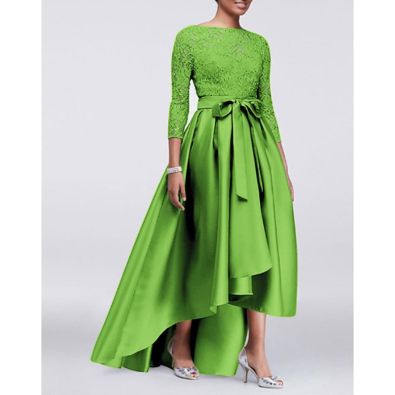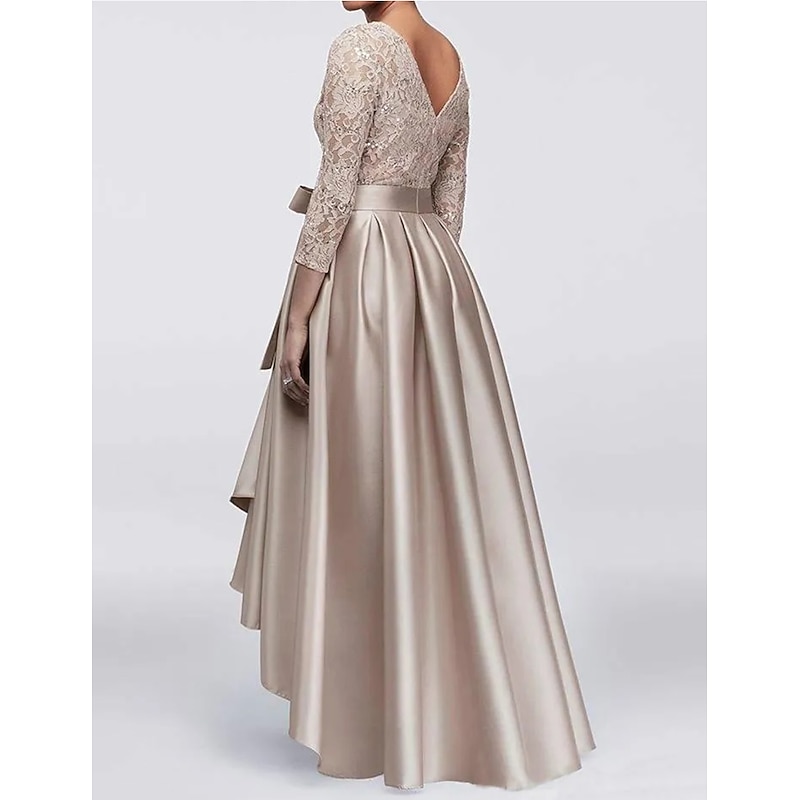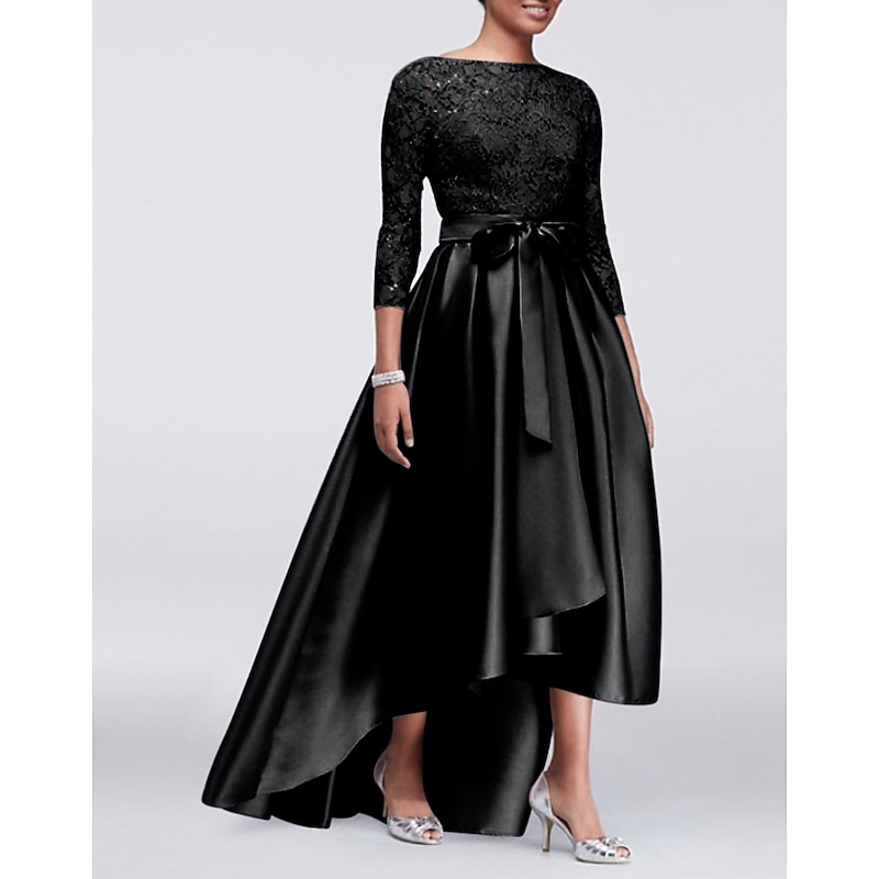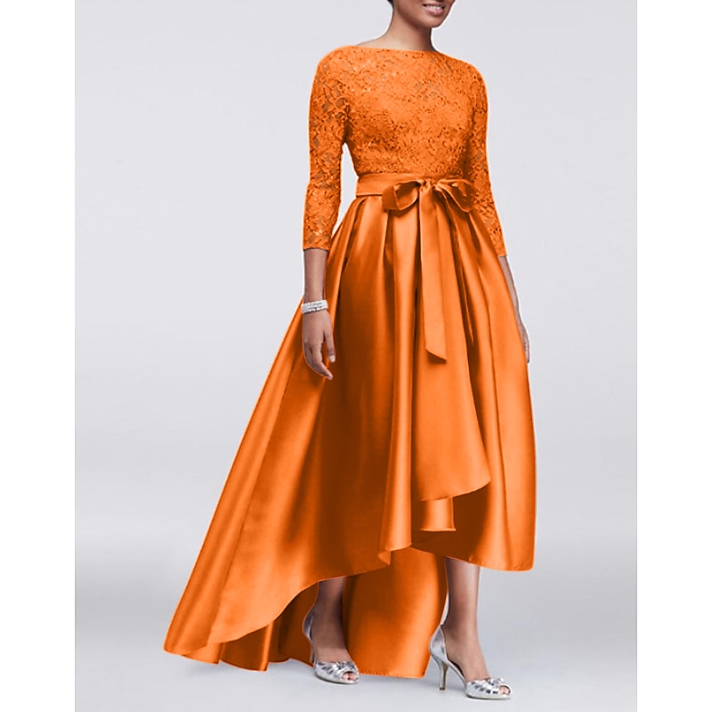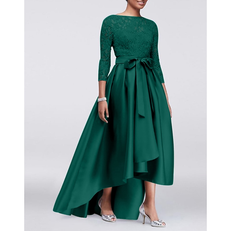 More information about A-Line Mother of the Bride Dress Wedding Guest Elegant Plus Size High Low Jewel Neck Asymmetrical Satin Lace 3/4 Length Sleeve with Sash / Ribbon Appliques