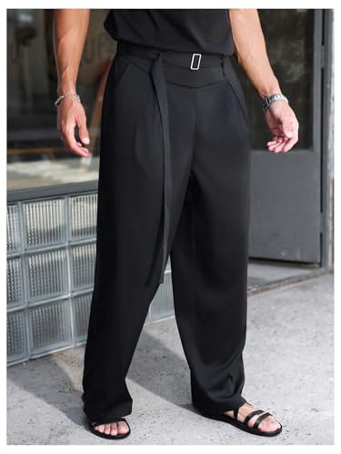 HOT ! GORGLITTER Men's Baggy Dress Pants Wide Leg Pleated Trousers Belted Chino Pants with Pockets