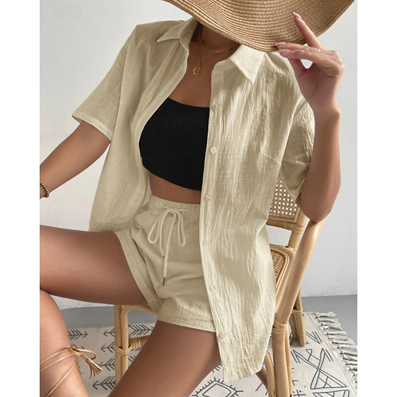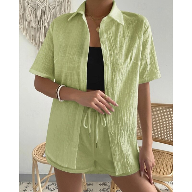 More information about Women's Fashion Streetwear Shirt Linen-Inspired Sets Two Piece Sets Below Knee Length Shorts Short Sleeve Shirt Collar Solid Color Drawstring Daily Wear Date White Green Khaki Summer Regular Fit