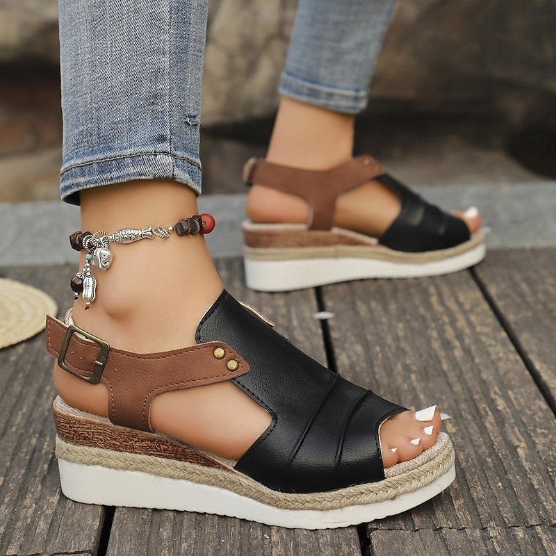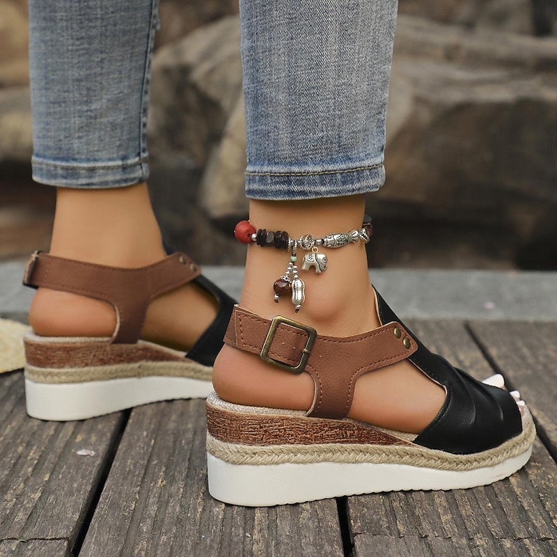 Highlights [Fabric] Crafted from high-quality faux leather, these wedge sandals provide durability with a luxurious feel. The upper materials offer a smooth finish that complements the classic and vintage style. [Fit and Silhouette] The sandals feature a wedge heel design with a platform base, offering both height and comfort. The peep-toe silhouette is perfect for showcasing summer pedicures, and the adjustable strap ensures a secure fit. [Design Highlights] These sandals include a striking T-bar design embellished with a functional buckle for easy adjustment. The combination of earthy tones and vibrant color options, like black, red, pink, navy blue, and dark brown, adds versatility to your wardrobe. [Occasions] Ideal for a variety of occasions, these sandals seamlessly transition from daily office wear to weekend parties and casual home gatherings. Their stylish design complements both jeans and dresses, making them perfect for any summer outing. [Size] Available in a range of sizes from US6/EU36/UK4 to US10.5/EU42/UK8.5, please refer to the size chart provided by the supplier to find your perfect fit.