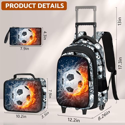 Soccer Rolling Backpack for Boys - 3PCS Boys Rolling Backpack with Lunch Box Set for Kids Children Teens Elementary Middle School,Sport Roller Bookbag with Wheels for Age 6-18 6
