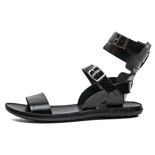 Men's Gladiator Sandals Black Leather Sandals Ankle Strap Design with Double Buckles Casual Non-slip Breathable High Top Outdoor Beach Shoes 7