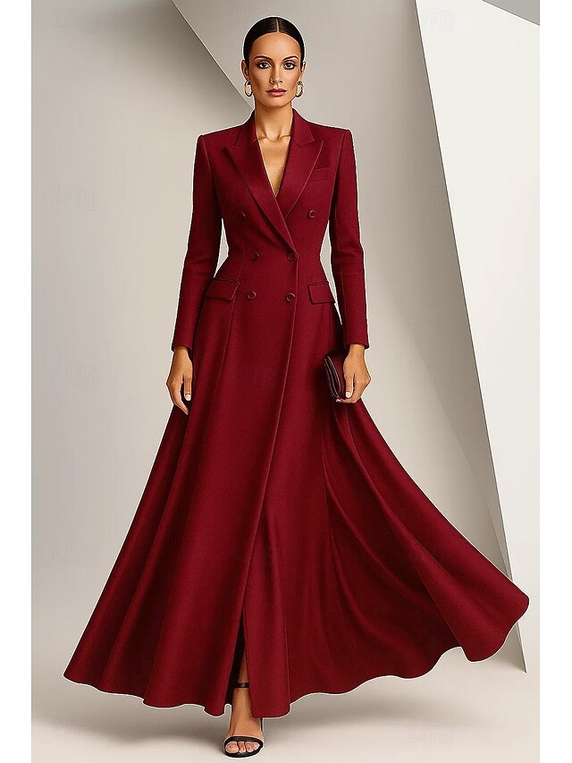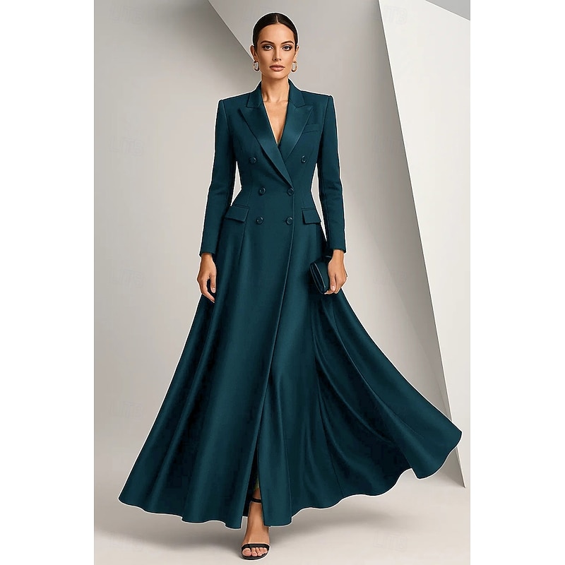 Tuxedo Dress A-Line Mermaid Formal Wedding Guest Satin Elegant Long Sleeve Ankle Length Peak Lapel Double Breasted 8