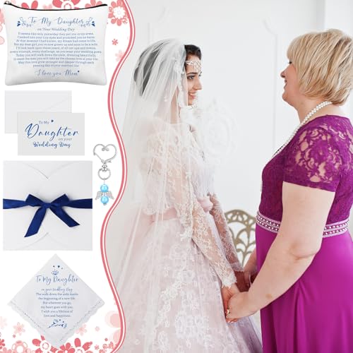 6 Pcs Wedding Gift to Daughter from Mother Include Embroidered Handkerchief Bride Angel Charms Card Makeup Bag Petal Envelope Blank Envelope for Wedding Day Bridal Shower Keepsake 1